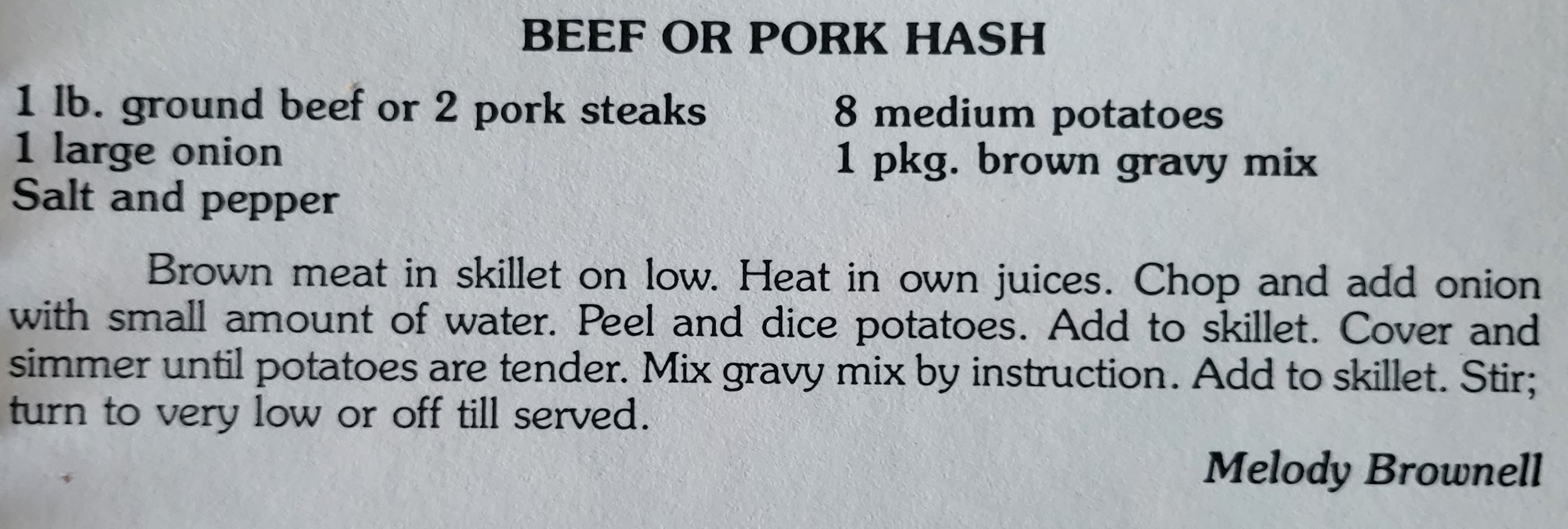 Hash, as it pertains to food, comes from the French verb “hacher” which means “to chop.” “Hache” and “hachey” were used as far back in England as the 14th century to describe chopped meats, and there are many different varieties of hash in many countries. Some are here in the states made with pork and offal (guts and innards and stuff) and others are in Denmark and Germany made with about the same random assortment of meats and chopped onions. It’s no surprise that a version of this dish is universal; it’s a good way to use less desirable meats and leftovers and turn them into something fun (?) or at least edible. This is a classic example of a dish created from a situation of needing to eat all of an animal because it’s all you have. What I like is that it’s still obvious in the scarcity of ingredients listed in Melody’s recipe. And the fact that it’s very easy on the pocket book.