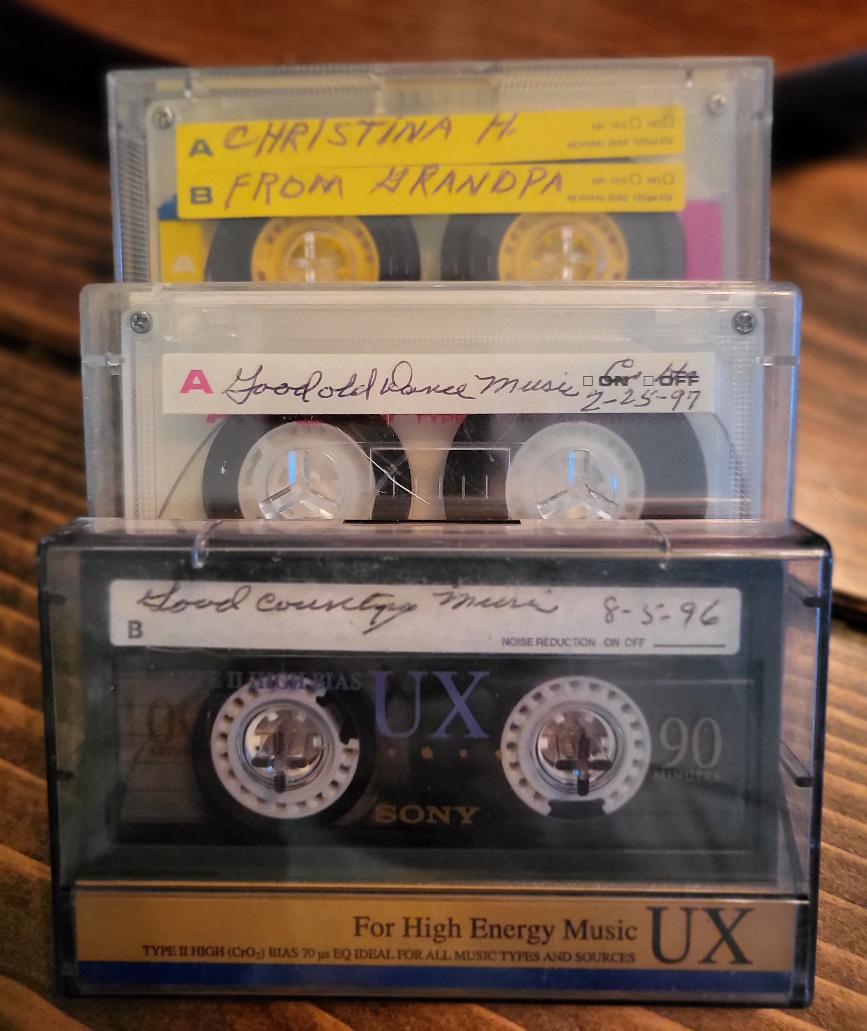 In the year before he died, swing music became popular again, and I was exploring big band sounds. I had a conversation with him about how I loved it and felt maybe I was born in the wrong era. He said he’d show me some good swing music and made me several mix tapes of some big band, a lot of Western Swing, waltzes, and a few classic country standards. (Here’s the essay I wrote about it). While typing this, I got distracted wondering where those tapes were. Then, a vision: I put them in our fireproof box with our other important papers. I ran to the garage, dug through, and found all seven of them. The last tape he made was in February of 1997. He handed it to me and said, “So you’ll remember me. I won’t always be around.”