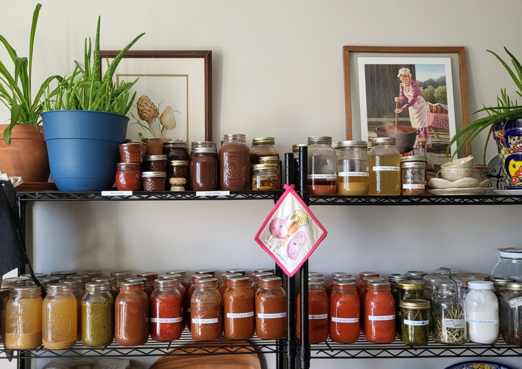 Gaby has been canning our tomatoes and preserving a lot of other things for years, but this summer she decided to try canning tomato juice. It’s more work than just making your own sauce because there’s blanching, peeling, crushing, and straining. The result, though, was nine quarts of salty garden goodness. I grew up drinking tomato juice straight from the Mason jar, so just seeing the deep red color sitting on our shelves sparks a whole nostalgic sensory experience for me. This is also one of the reasons I chose to make the sauce when I did during this project: I figured those of you reading along might have just canned your tomatoes, too, and even still have a few on the vines.