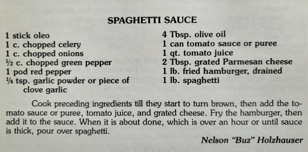 Like most recipes in this book, he used what he had on hand. What makes this recipe unique (in the cookbook and overall) is in a time of buying canned things from stores, my grandpa was making his own sauce from his own garden.