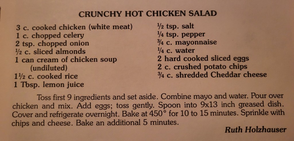 I was super hungry when I started this recipe, so I bought two rotisserie chickens. Aunt Ruth says this mixture should sit overnight in the fridge, so I knew we wouldn’t be eating it for another 24 hours. The plan was Gaby and I would eat one of the chickens with some rice and a salad for dinner that night. We decided against it, and Gaby said, “I’m just going to make a chicken salad.” While she did that, we both ate the hot chicken legs and thighs from the plastic bags and pulled and cut up chicken on our own cutting boards. It wasn’t until I’d finished putting this dish together and watching Gaby making her chicken salad that I realized what’s probably obvious to all of you…Aunt Ruth’s recipe is just baked chicken salad. It is exactly what it claims to be: a chicken salad, the kind you’d find in a deli on a sandwich, but heated up. With cheese and chips and rice and almonds.