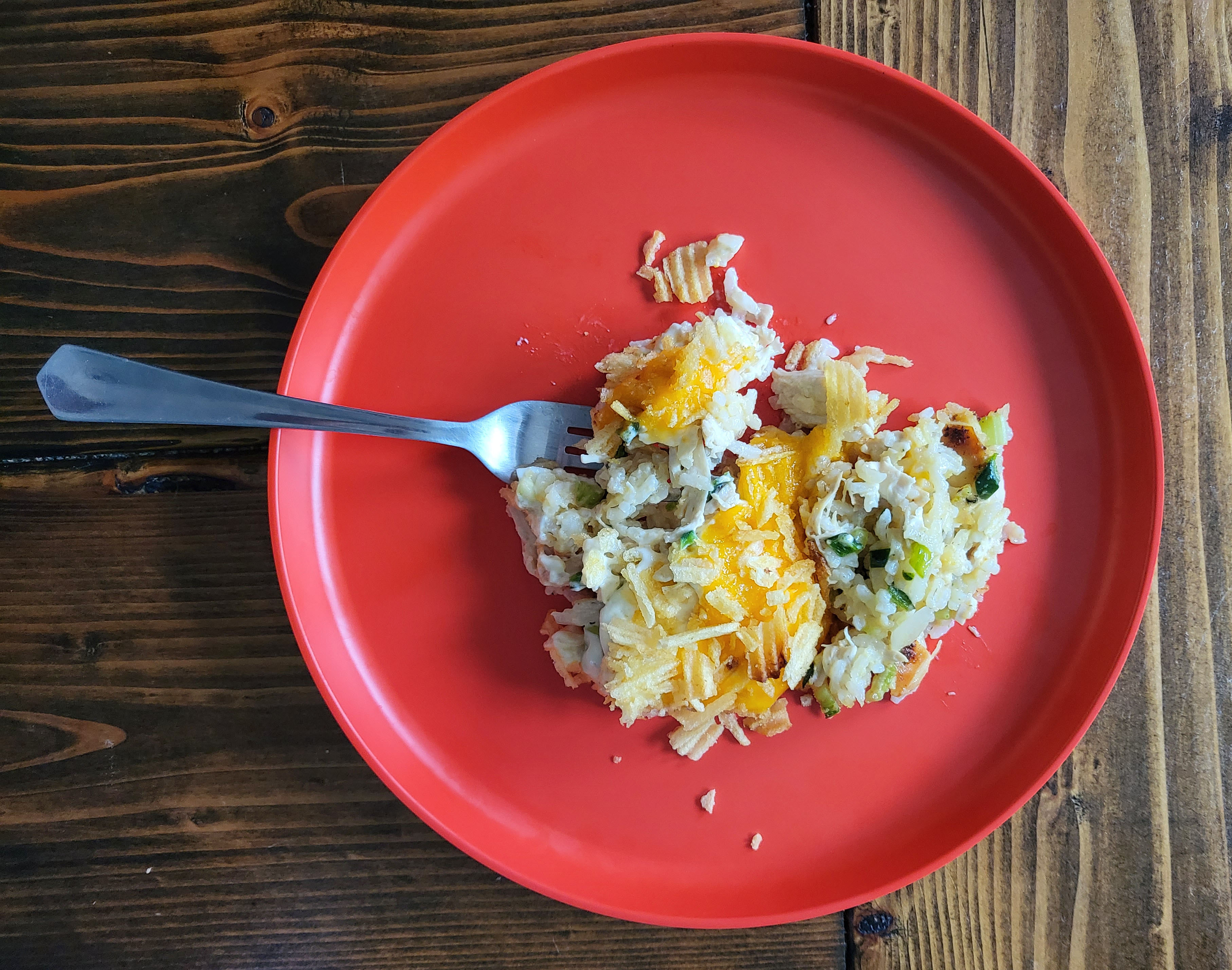 I can imagine this recipe was born of a need to use-up leftovers from some family get-together. You just happen to have some chips and rice from another dish, and you’re just like…fuck it. Throw it all in there. Add some cheese. It was in that spirit that I once again spied all of the poblanos still on our prep table and threw one in, too.