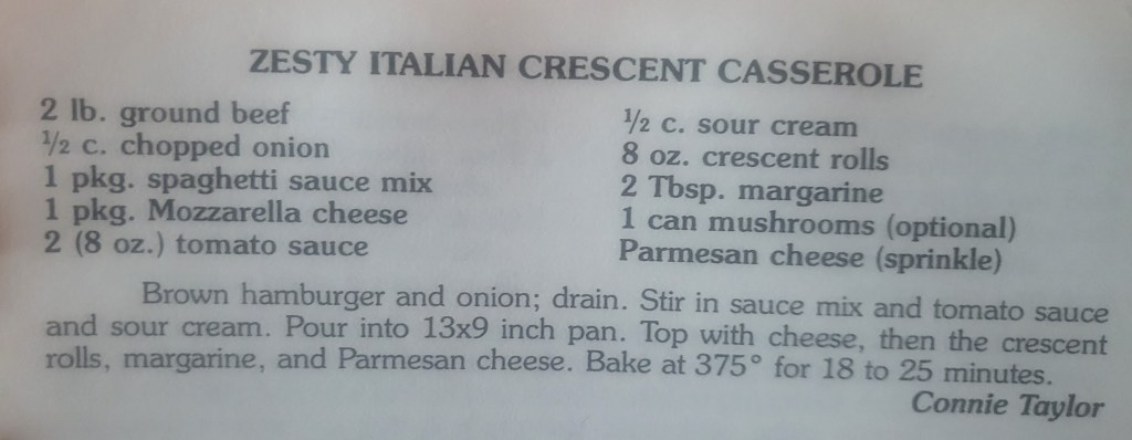 Most interestingly for you, she gave me one of her recipes from the church cookbook, handwritten and secured in a plastic sheath, and told me a little bit about the woman she got it from. She told me that my cousin loved this recipe and said it was basically an upside down pizza. I’d already planned on making this, but was stoked to get the recipe hand written with a quick backstory. You’re wondering what it is, the story about the woman who wrote the recipe, I can’t even remember now. Her name was Ms. Mosley of Mokane, MO. The details of her life were thrown in so quickly with the family secrets, that I remembered only those. And, of course, those can’t be shared so easily as a recipe.