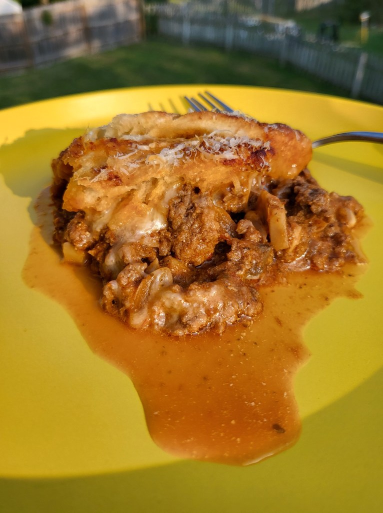 Directions: Brown the beef and onion. Don’t forget some salt and pepper. Maybe some garlic, too. Stir in the sauce and sour cream. Pour into a 9 x 13 dish. Top with the mozzarella cheese, then crescent rolls (in one big sheet), butter, and some parmesan cheese. Bake at 375 for about 18 minutes.