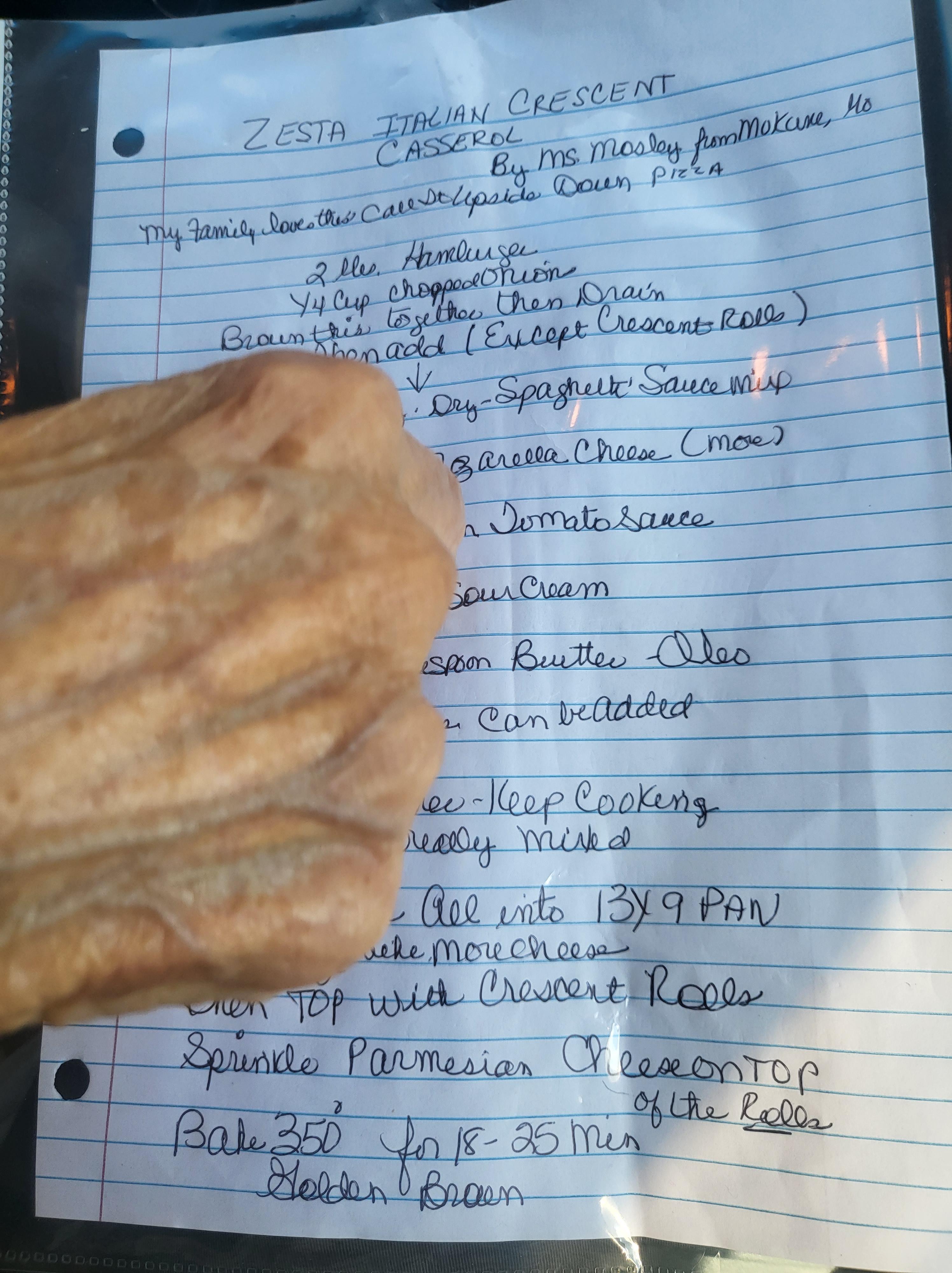 Most interestingly for you, she gave me one of her recipes from the church cookbook, handwritten and secured in a plastic sheath, and told me a little bit about the woman she got it from. She told me that my cousin loved this recipe and said it was basically an upside down pizza. I’d already planned on making this, but was stoked to get the recipe hand written with a quick backstory. You’re wondering what it is, the story about the woman who wrote the recipe, I can’t even remember now. Her name was Ms. Mosley of Mokane, MO. The details of her life were thrown in so quickly with the family secrets, that I remembered only those. And, of course, those can’t be shared so easily as a recipe.