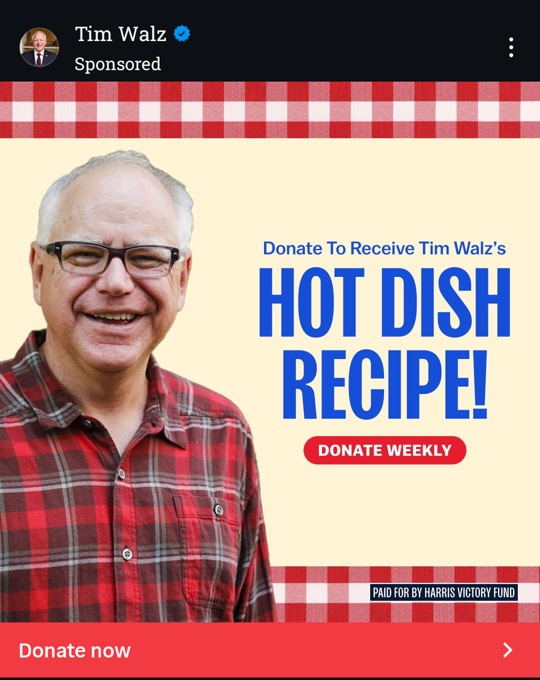 About 8 weeks ago I started seeing all these ads on my Instagram for Tim Walz. They said if I donated to the campaign I could get his hot dish recipe. I spent a few weeks scrolling past, but smiling every time at the wholesomeness of the ad. I mean, look at this guy in his flannel shirt that matches the table cloth we know and love from Pizza Hut or any family function: